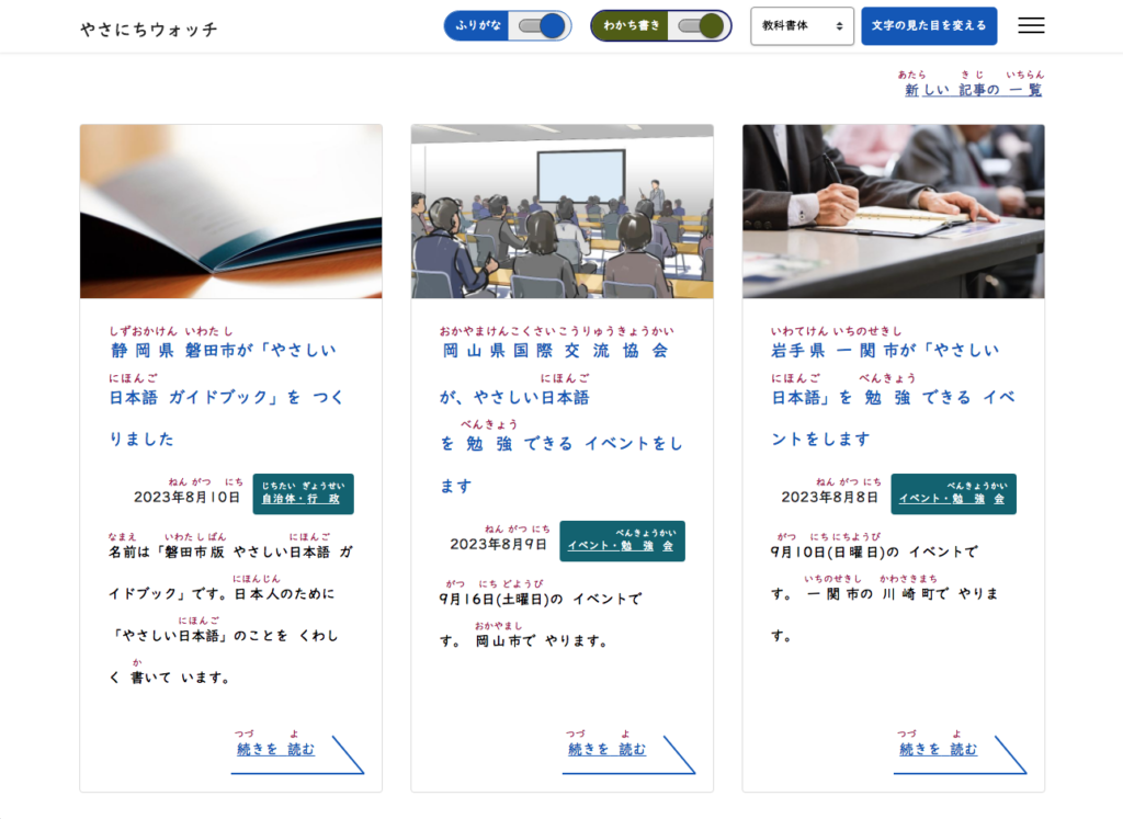 Given this, the concept of Easy-to-read Japanese is spreading to foreigners in Japan who understand some basic Japanese. “Easy” encompasses both “kind” and “easy” meanings. Easy-to-read Japanese simplifies difficult words into easier ones, adds furigana (phonetic guides) to kanji, and avoids complex sentences. This helps foreigners who can read hiragana and simple kanji to understand the text quickly. It also benefits children with limited language skills, the elderly, people with visual traits that make reading complex texts difficult, and tourists from abroad.