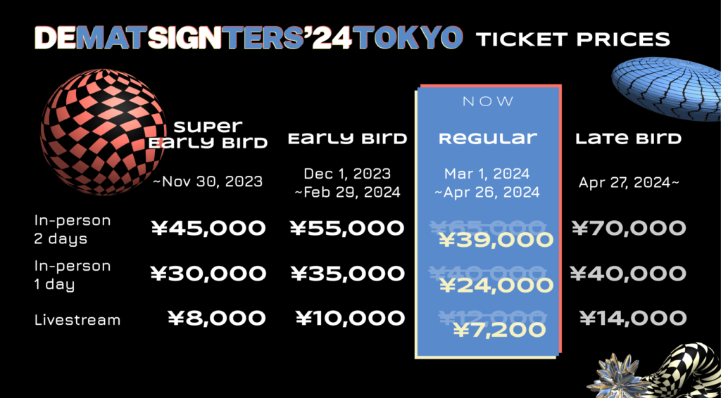 As a partner in energizing the Design Matters community in Japan, Spectrum Tokyo is implementing a special discount campaign. When you purchase tickets through Spectrum Tokyo’s link, the ticket price will be discounted by 40%. This is a limited-time offer available until January 31, 2024 → March 31, 2024, so be sure to take advantage of this opportunity and purchase your tickets.