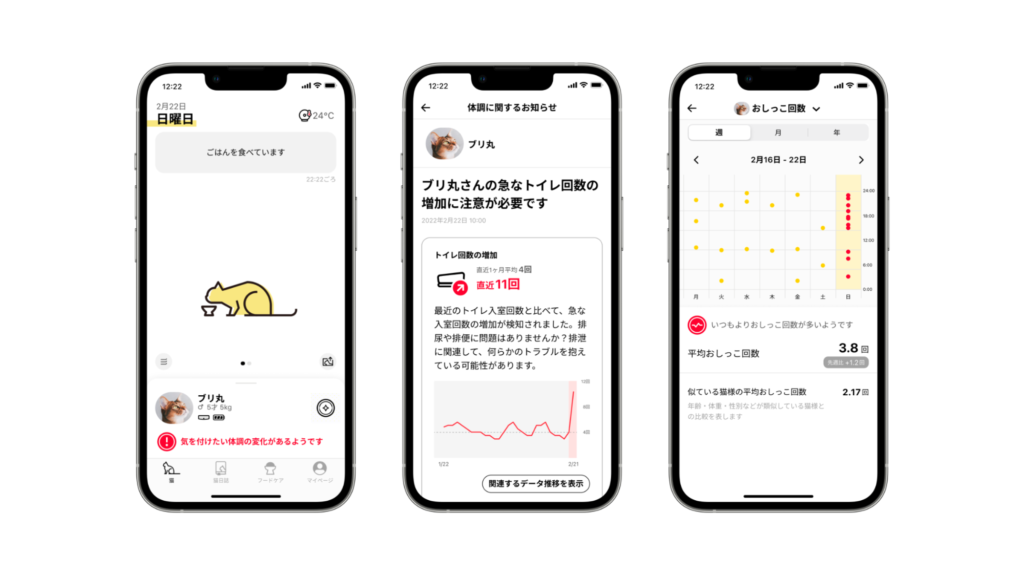 Nozomi: We value conveying information based on data and encouraging correct judgment based on that information. Intuition is also important, but subjective and vague perceptions like “Hmm, my cat seems to be going to the litter box more often today” can cause the owner to miss the timing to go to the vet or overlook it as just their imagination. Generally, there is a tendency for cat owners to have fewer opportunities to take their cats to the vet, so they are less likely to take action unless it is something serious. With Catlog, we aim to provide objective numerical information such as “Normally, my cat goes to the litter box three times a day, but today it has gone 11 times,” so that owners can make the correct judgment of “I should take my cat to the vet.”