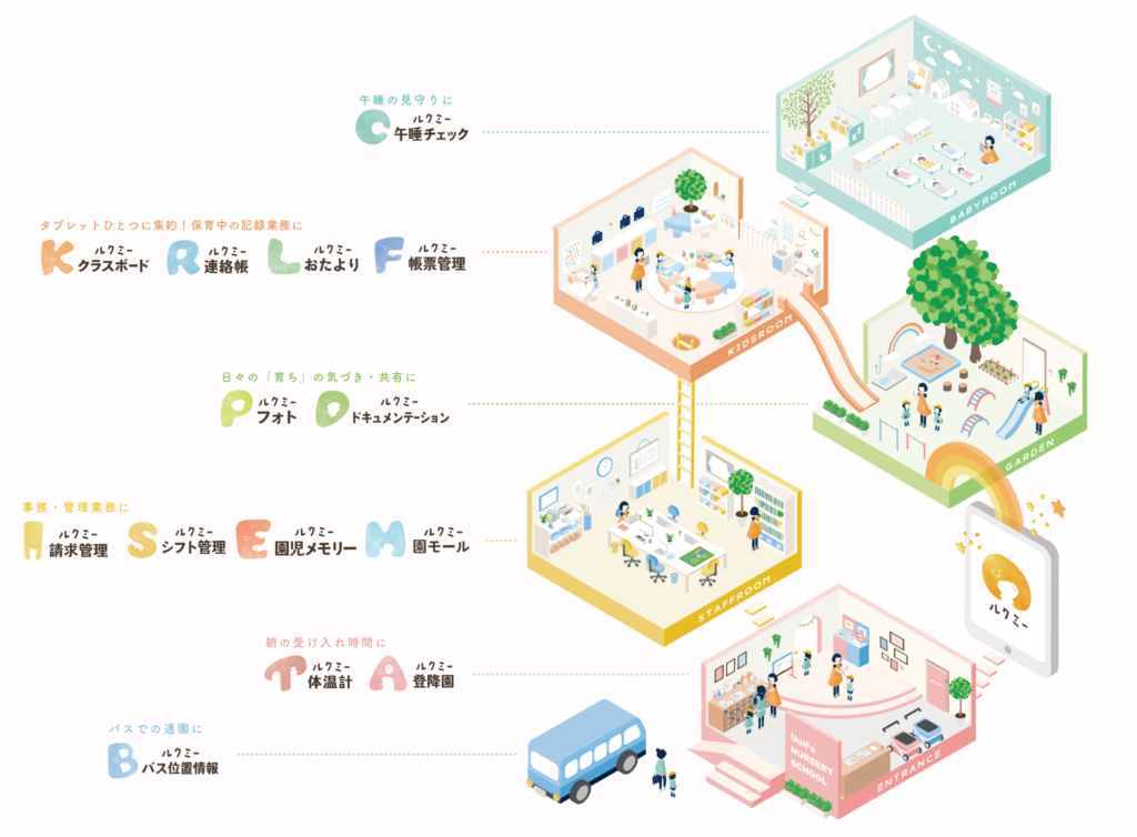Takahiro: Lookmee is a comprehensive ICT service for childcare facilities that aims to create a rich environment for children and support the improvement and assurance of childcare quality. We offer 14 products, including the Lookmee Renrakucho (communication book) and the Lookmee Otayori (letter), which cover everything needed from when a child arrives at the facility until they return home. Through these products, we aim to reduce the workload of teachers and create more time for them to engage with the children.