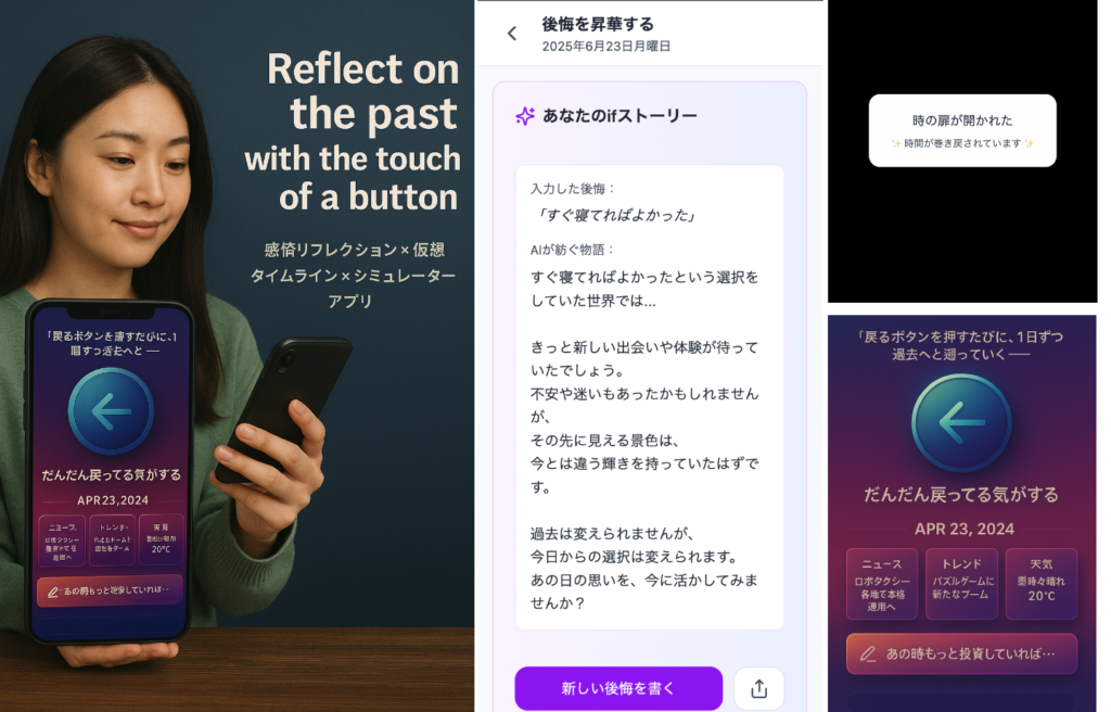 画面にはニュースや天気など、戻った日の情報がリアルに再現されます。当時の後悔を記録すると、AIが「もしその選択をしていたら…」とストーリー化してくれます。「戻ってる気がするだけ」を楽しめる内省ツールです。