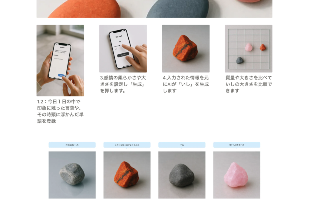一日の体験や感情を短い言葉で記録し、その内容に応じた“いし”を生成するアプリです。印象に残った言葉を入力し、感情の大きさ・柔らかさを選ぶと、AIによって見た目やサイズの違う“いし”が生まれます。集めた“いし”は一覧でき、過去の気持ちを見返すことも可能です。かわいらしいビジュアルで、自分の心の動きを楽しく可視化できます。