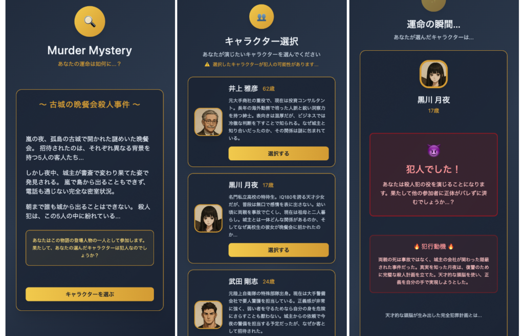 マーダーミステリー(※人狼ゲームのように犯人役のプレイヤーがいる推理ゲーム)の冒頭部分、「キャラクター選択」だけを楽しめるアプリです。