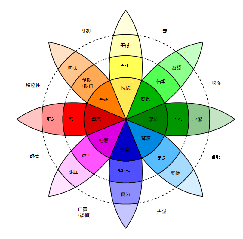 プルチックの感情の輪は、基本感情を8つに分けています。喜び、信頼、恐れ、驚き、悲しみ、嫌悪、怒り、予期(期待)で感情輪の中心のひとつ外の輪に属しています。この8つの基本感情に対しての強弱によって別の感情がマッピングされています。感情輪の中心にいくと強い感情で、外が弱い感情となります。嫌悪をみると、より強い感情の憎悪が中心に、退屈が外側に位置しています。そして、基本感情の8つの組み合わせがそれぞれの間にあります。愛、服従、畏敬、失望、自責(後悔)、軽蔑、積極性、楽観です。それぞれの感情の境はこの図をみると非常に微妙ではっきりと自覚するのは難しいのでは、と感じる人もいるのではないでしょうか。なお、プルチックの感情の輪はもともとが英語なので、完全にその感情を表現する日本語がなく、しっくりこない部分もあるでしょう。オリジナルの英語版も載せましたので、比較してみてください。