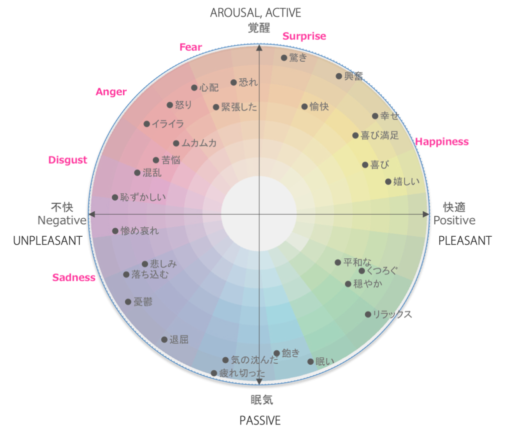 さてみなさん、どんな感情でしたか? 「ハッピー」「嬉しい!」なんてポジティブな感情? 「辛い」「怒り」といったネガティブな感情? それとも「リラックス」「まったり」でしょうか。「だるい」「疲れた」なんて人もいたと思います。感情を一言で、と言いましたが、「疲れた」「だるい」などは感情でしょうか? 日本人にとって感情分類というと喜怒哀楽の4分類が身近だと思います。「だるい」は心身的状態を表す言葉であることは間違いないと思いますが、感情に分類するか、ここは意見が分かれるところでしょう。みなさんの回答は、感情でしたか? 心身状態でしたか?