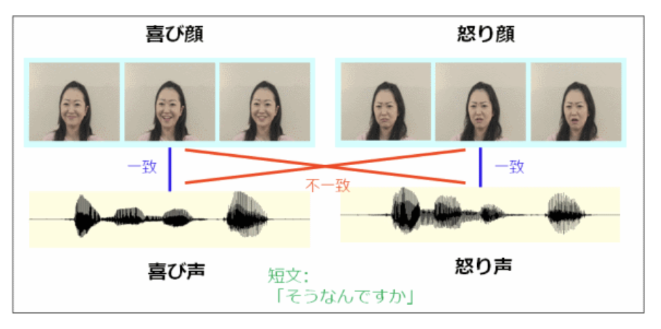 ②顔と声の情動が不一致(例:喜び顔+怒り声)となる動画