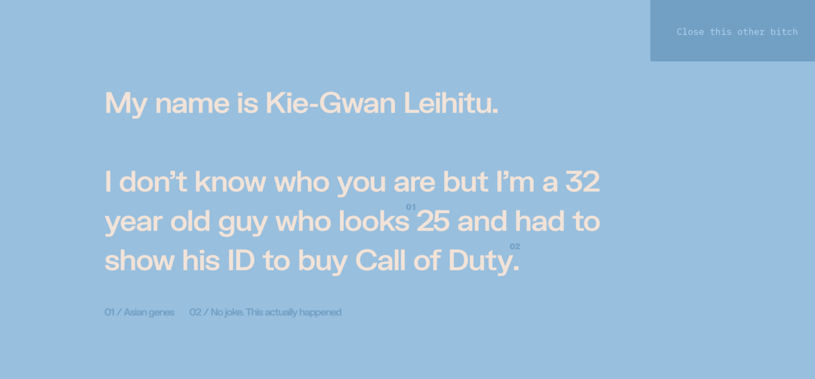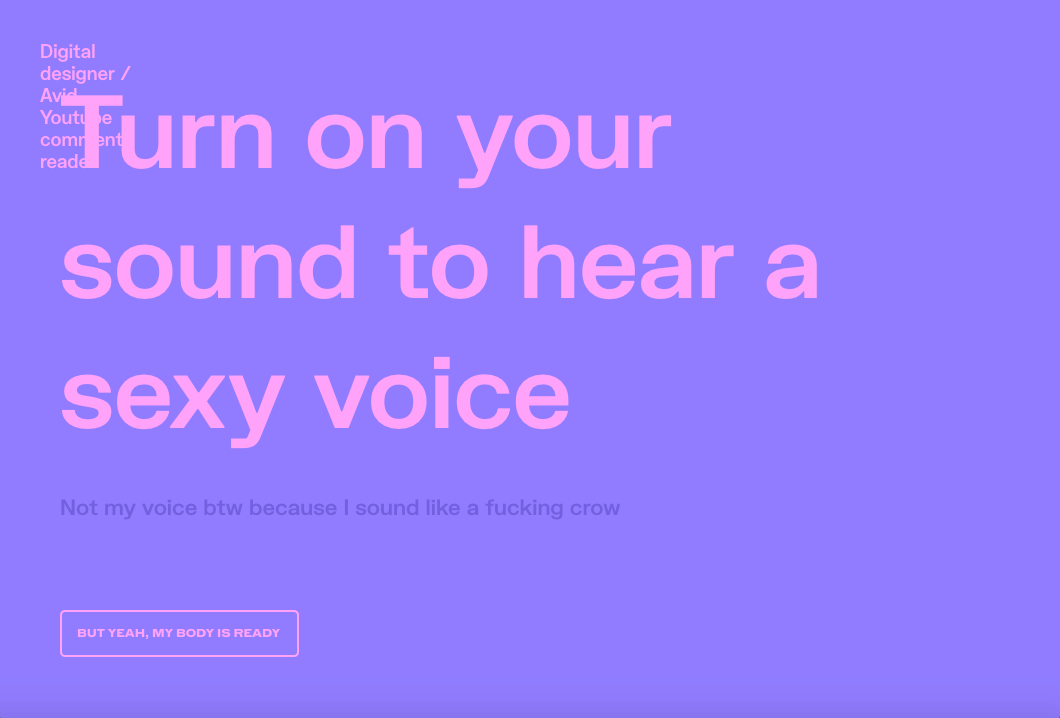 ありのままの自分が気に入らないなら、自分にとって居心地のよいあり方にこだわればいいのです。私の場合はポートフォリオに、中指を立てたGIFとボイスオーバーとくだらないCTAを載せています。同僚は皆、「バカバカしくって冗談好きな君そのものだね」といいます。誰に対しても同じことがいえます。Webサイトは、オンラインにおけるあなた自身なのです。それに、ほんの少しのユーモアは誰も傷つけません。