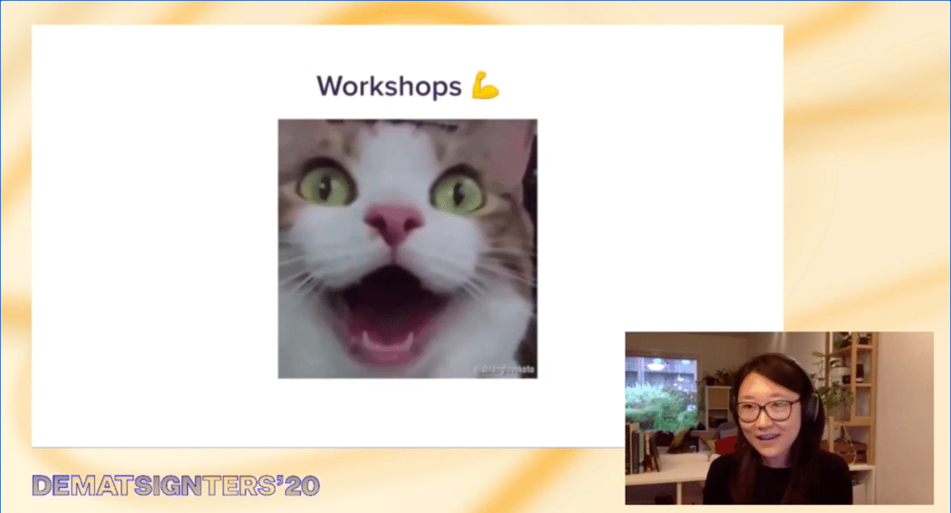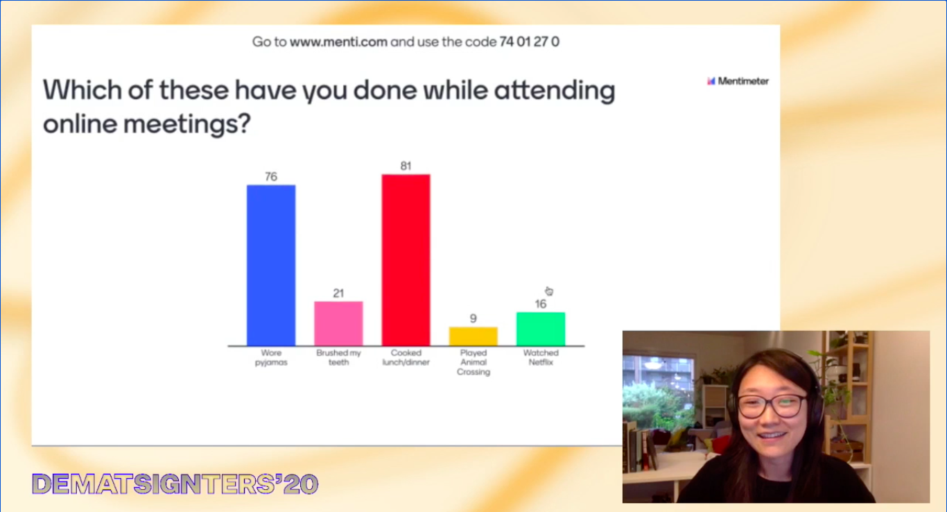 ──Design Matters 20の冒頭で、あなたはMentiでの投票を行い、人々がリモートでのミーティングやワークショップの間にどんなことに気を取られているかを遊び心たっぷりに示されました。歯を磨いている人や、Netflixを見ている人もいましたよね。参加者をもっとコラボレーションのプロセスに巻き込むためにあなたが見つけられたヒントについて、あるいはご自身が実行されていることについて、もう少し説明していただけますか?