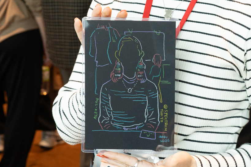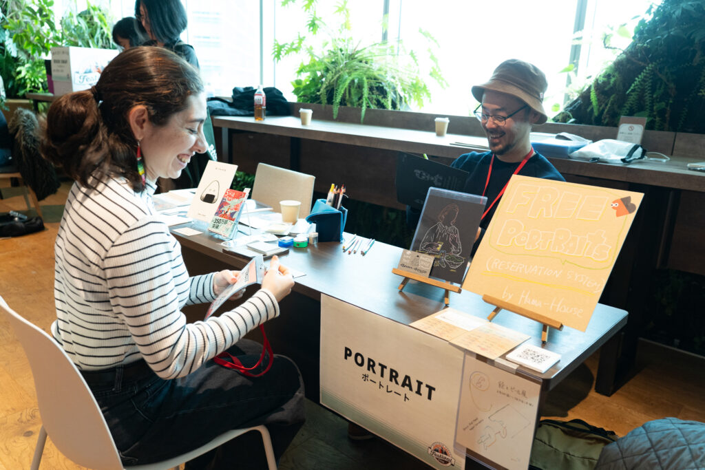 去年、ご登壇いただいたイラストレーターのHama-Houseさんが、もっと参加者と話したいということで、急遽会場横にテーブルを置いて、似顔絵コーナーを設けてくれました。これが大人気で、2日間予約制にしないとさばききれないくらいでした。そして今年も、なんとHama-Houseさんの方からまたやってくれると、願ってもないお話をいただきまして、実現しました。しかも去年の反省を活かして、より多くの人を回せるようにとそれに適した画風まで考えていただいて、また2日間、ひっきりなしに描きまくっていただきました。