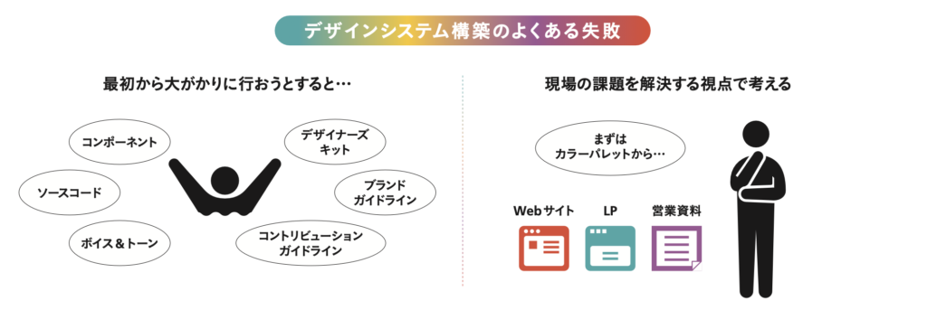 河西 僕は、「デザインシステムをつくる」ではなく、「組織課題に対して必要な仕組みをつくりましょう」と言い換えることが多いです。課題を可視化して、必要なデザインシステムに求められるアセットの構成を具体的に詰めていく感じです。