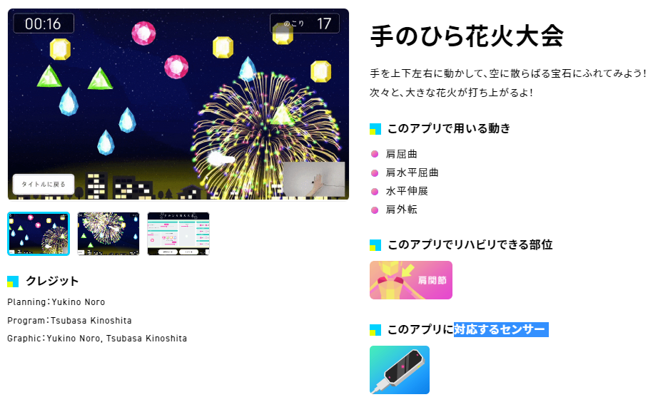 仲村:アプリの例としては、手を上下左右に動かして花火を打ち上げる中で上肢のリハビリが可能な「手のひら花火大会」、わずかな動きの変化を検知するセンサーを用いて、デジタル水鉄砲で待ち行く人にいたずらできる「びしゃびしゃパニック」などがあります。現在は34のアプリが公開されており、利用者がニーズに合わせて選択できる形にしています。