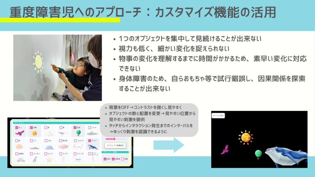 カスタマイズ機能にも、そういった「ひとりでも多くの子が楽しめるように」という意図があります。障害は非常に個別性が高いので、アプリの数を増やすことも大切ですが、それぞれにぴったり馴染むものをつくるためには個別最適化を計る必要があるのです。