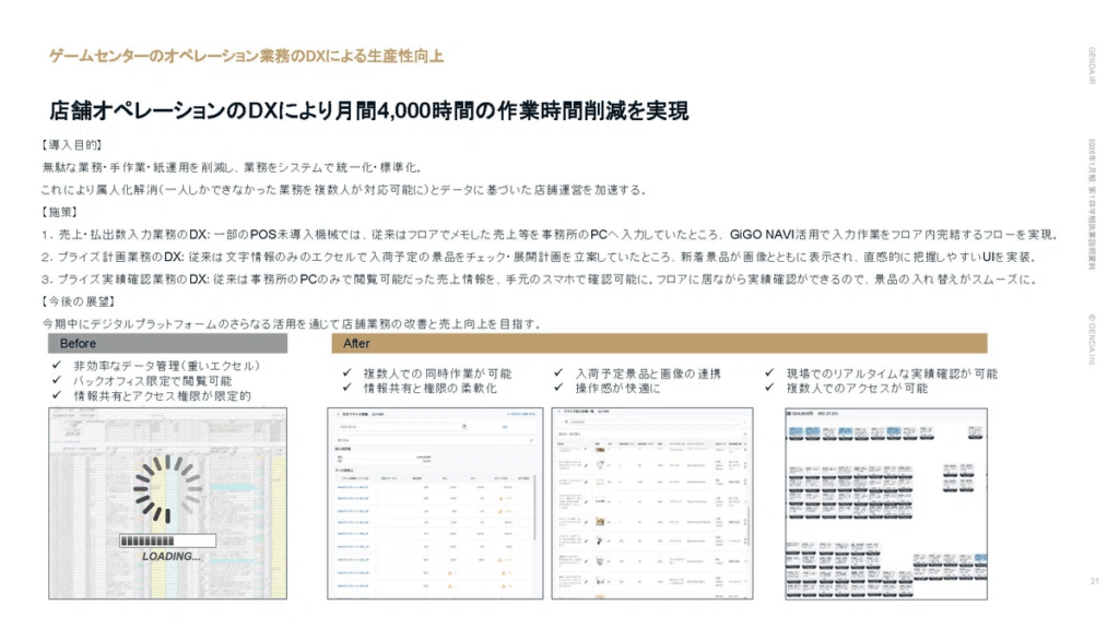 実際の成果としても、月4,000時間の業務時間削減という数値が出ています。景品関連の管理機能のアウトカムとして2024年に検証したものなので、他の機能も含めて現在は更なる効果改善が見込まれます。これまで一部のスタッフがバックヤードに戻ってやるしかなかった業務が、「GiGO NAVI」によってフロアでアルバイトの方でも対応できるようになり、業務の効率化・平準化の改善、そして作業時間の大幅削減につながったと考えています。