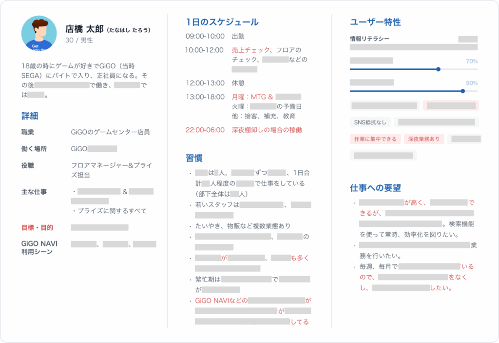 最初に取り組んだ景品関係の機能作成では、担当となるフロアマネージャーを最優先のペルソナとしました。彼らはどのような年齢層で、毎日どんな業務をしていて、ITツールにどの程度馴染んでいるか……といった細かいペルソナを定めました。