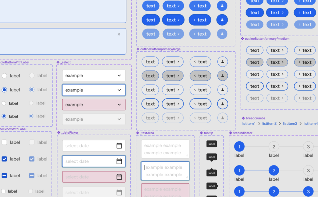 大村:色やチェックボックス、ボタンなどの基本的なコンポーネントは揃いつつあります。ただしTurtleは立ち上げて日が浅いため、BreadcrumbsやStepperなどまだ用意がないものも多いです。そのため、各プロジェクトで新規につくったものから採用してTurtleに蓄えるという運用をしています。