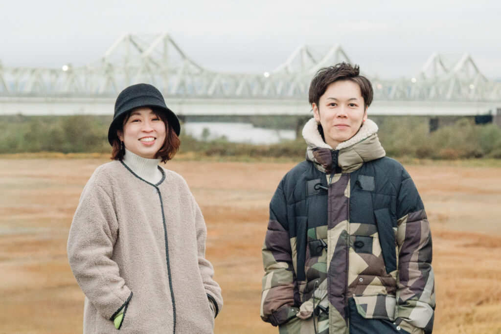 山﨑さん(右)と宮﨑さん(左)。長岡花火の会場となる信濃川河川敷で冬に撮影
