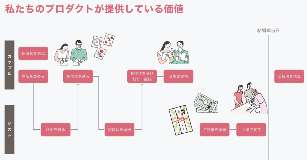八木:理由としては大きく2つあります。ひとつは式場が決まったあと、結婚準備の最初のタスクがゲストの招待になるためです。そして2つ目は結婚式を挙げるカップルを調査した結果、特に手間のかかるタスクとして挙がっていたのが招待状だったので、顕在化しているニーズのここから始めようとなりました。