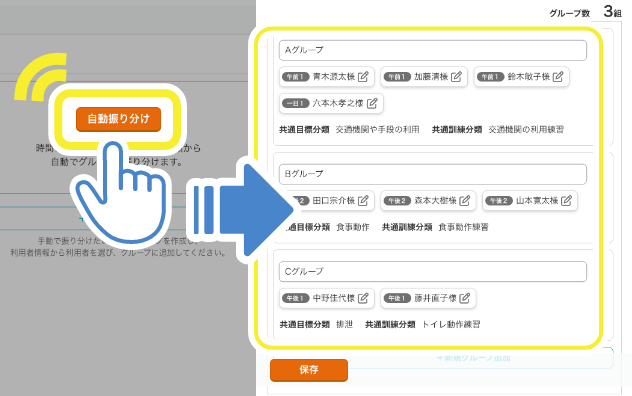 とはいえ、その日来ている人の中から毎回人力でグループを組むのは本当に大変で……。それをボタンひとつで叶えてくれるのがこの機能です。同じグループの人には、一括で同じ記録をつけることもできます。