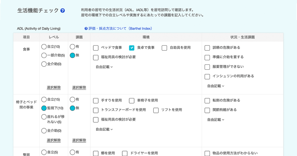 若林:計画書の自動提案は、介護保険制度で定められた工程に則って情報を入力いただくところから始まります。生活機能チェックシートで「一人で屋内移動ができるか」などの生活課題を確認して生活自立度の評価を行うほか、興味関心チェックシートで「もう一度一人でできるようになりたいこと」はなにか、本人の希望を確認します。これらを入力して最後に身体機能評価を行うと、ボタンひとつで目標やリハビリメニューなどが提案され、計画書の作成が完了します。