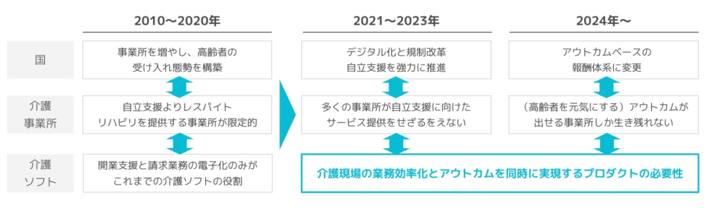 以前は国も預かり先としての事業所を増やすことに注力していましたが、こういった状況を受けて2021年からはデジタル化による生産性向上と自立支援の推進に重きが置かれ、この4月からの3年間ではより一層アウトカム、つまり要介護者の状態の改善へのフォーカスが強まるなど、介護保険制度そのものの方針も大きく変化しています。科学的なリハビリを実施することで健康に過ごせる期間を伸ばし、介護を必要とする高齢者を減らすことが、今後の介護業界にとって重要なポイントなのです。