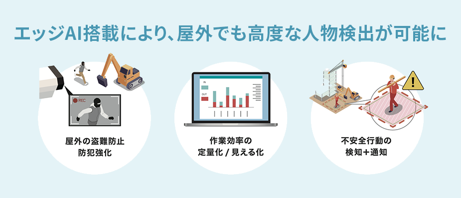 碇石:防犯寄りの活用例になりますが、建設現場では不安全行動(*)の予防に活用されています。機能の中に「立ち入り検知」という仕組みが備わっており、危険エリアに人が立ち入ると検知して通知したり、見守れるようになっています。現場監督が、映像を通じて遠隔で確認・管理できるのがポイントです。