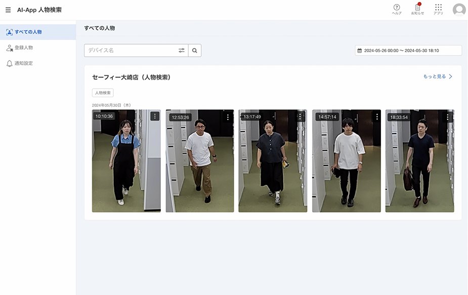 前田:主に不正ロス対策を目的とした「AI-App 人物検索」があります。過去の映像から検知対象を検索し、対象人物の再来店を検知して通知するソリューションです。検知対象を登録できるので、これまで膨大な時間をかけて過去映像を調べていたプロセスを削減し、ワンクリックで調査できるのがメリットです。