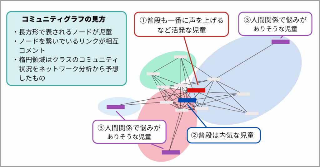 コードタクト社の実証レポートより。長方形は個人を表し、他者の課題へのコメントなど、つながりの多さを線で可視化。②の「普段は内気な児童」が、クラスの中心的な存在になっていることが確認されている。