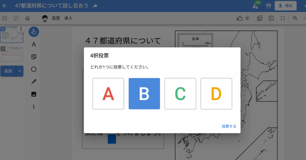 こういったことがないように、「スクールタクト」ではアンケートなどの補助的な活動をする場合、ワークシートの画面上に重ねて表示し、その中で完結するようにしています。アナログでたとえるなら、机の上にワークシートを出したまま、その上で必要な道具を取り出して対処し、終了後またワークシートに戻る……といったイメージです。なるべく1画面に必要な要素をまとめるようにしています。