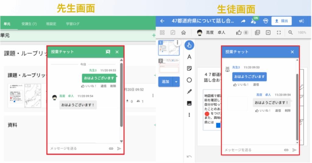後藤:「授業チャット」の機能設計でしょうか。子ども同士が意見を交わす場として、個々のワークシートへのコメント機能とは別に、授業全体で使えるチャット機能があります。当初この「授業チャット」は、先生も子どもたちも平等に送れる設計、つまりヒエラルキーのない構造にしていました。運用が始まると、特に小学校の先生から「“うんこ”と書く人がいる」などが報告され、「先生しか送れない状態をデフォルトにしてほしい」という要望をいただいたのです。