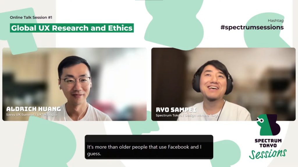Spectrum Tokyo初のオンラインイベント「Spectrum Tokyo Sessions」の記念すべき第一回は台湾出身のAldrich Huangさんをゲストに迎え、UXリサーチについてのオンライントークセッションを行いました。AldrichさんはグローバルなUXリサーチに特化した、米国の「UXTesting」という会社の代表を務めつつ、同じくグローバルなUXデザインカンファレンス「Savvy UX Summit」のオーナーでもあります。そんな彼の経験から、それぞれの国の特性や世界でリサーチをする際のコツ、そしてリサーチにおける倫理についてお話しいただきました。