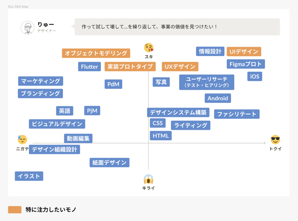 入社直後のCTOとの1on1で、自分の得意・苦手と好き・嫌いなスキルをまとめたスキルマップを共有していたので、自分のスキルを活かせるちょっとしたタスクがあった際に、ふってもらうこともありました。