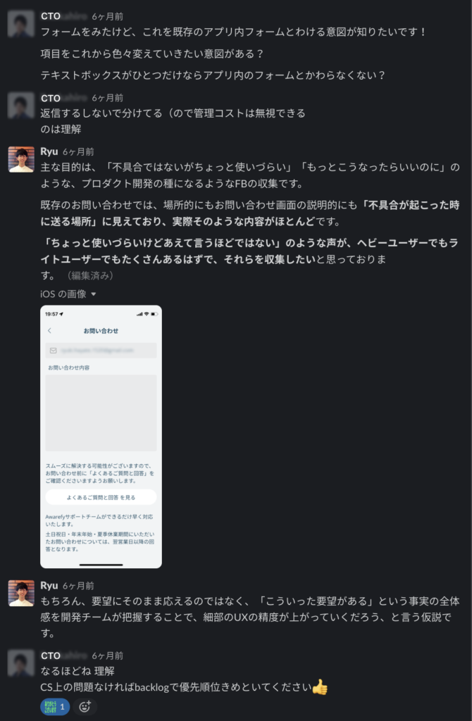村上:そのときは、自分の意見をはっきりと伝えました。「いまのお問い合わせフォームは不具合が起きた人が、頑張ってたどり着いて報告をするという場所になっていますが、もっと気軽にユーザーの声をAwarefyに届けることができる場所があったほうがよいです。そうすることで、ユーザーからの要望があるという事実を知った上でデザインに着手できるので、より細部までUXを磨きこんでいけるようになります」と自分の意見と理由を明確に伝えたことで、理解を得ることができました。